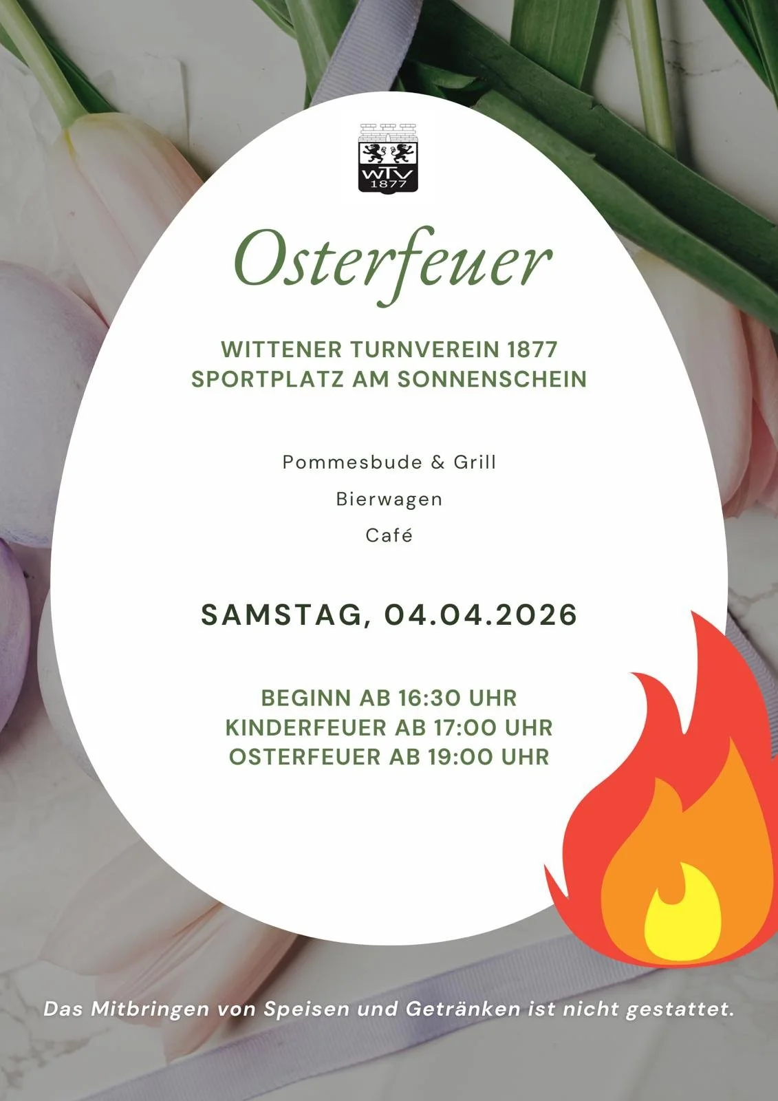 Der Wittener Turnverein 1877 lädt herzlich zum Osterfeuer am 04. April 2026 am Sportplatz, Sonnenschein 2a 58455 Witten, ein. Ab 16:30 Uhr startet die Veranstaltung, bei der Groß und Klein einen entspannten Abend in gemütlicher Atmosphäre verbringen können.
